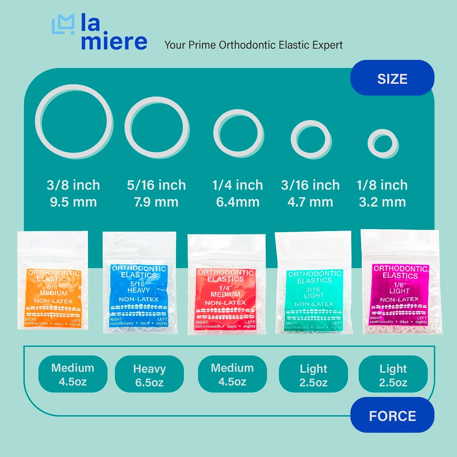 - [Sizes include] carries all orthodontic elastic band sizes, colors and weights: 1/8, 3/16, 1/4, 5/16 and 3/8 LIGHT FORCE 3.5 oz, MEDIUM FORCE 5 oz and HEAVY FORCE 6.5 oz